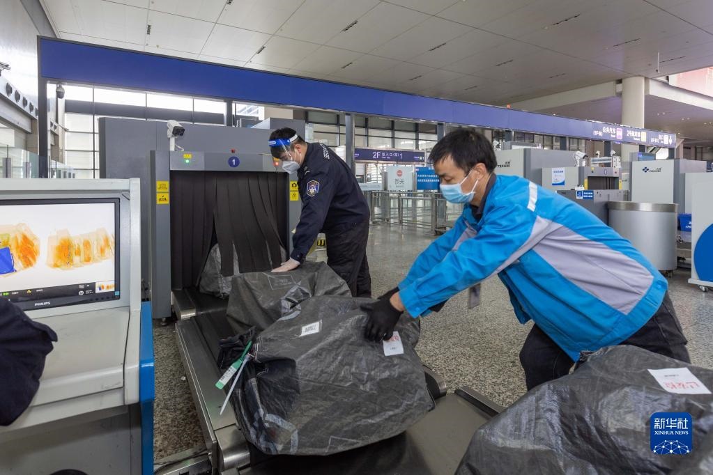 11月1日,在上海虹橋站內(nèi)貨物專用安檢口,鐵路工作人員搬運(yùn)通過(guò)安檢的貨物。新華社記者 王翔 攝
