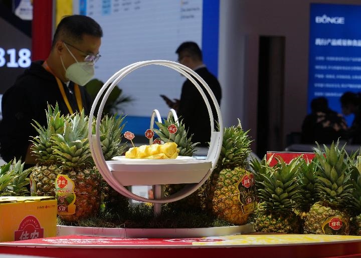 11月5日在第五屆進博會食品及農(nóng)產(chǎn)品展區(qū)拍攝的菲律賓黑鉆鳳梨。新華社記者 劉穎 攝