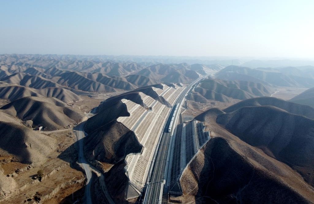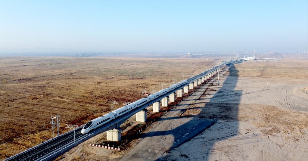 試驗列車在銀蘭高鐵甘肅段內(nèi)運(yùn)行。新華社發(fā) 袁暉 攝