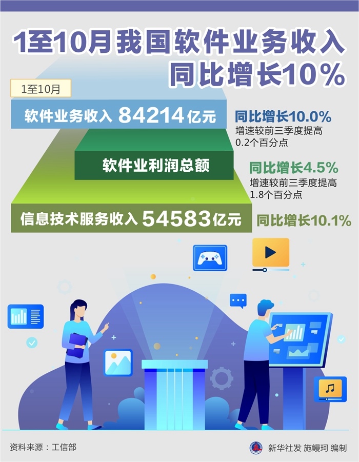 記者24日從工信部獲悉,1至10月,我國軟件和信息技術(shù)服務(wù)業(yè)運(yùn)行態(tài)勢(shì)平穩(wěn)向好,軟件業(yè)務(wù)收入84214億元,同比增長(zhǎng)10.0%,增速較前三季度提高0.2個(gè)百分點(diǎn)。