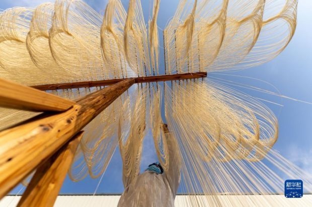 12月12日,在竹塘社區(qū)掛面合作社的掛面車間,工人將掛面上架晾曬。新華社發(fā)(阮雪楓 攝)