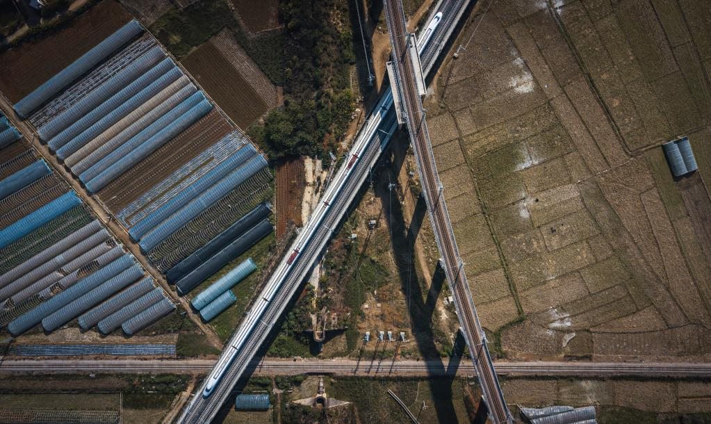 12月16日,列車行駛在與玉河鐵路(上)、滇越鐵路(底層)相互交叉的彌蒙高鐵線(中)(無(wú)人機(jī)照片)。新華社記者 王冠森 攝