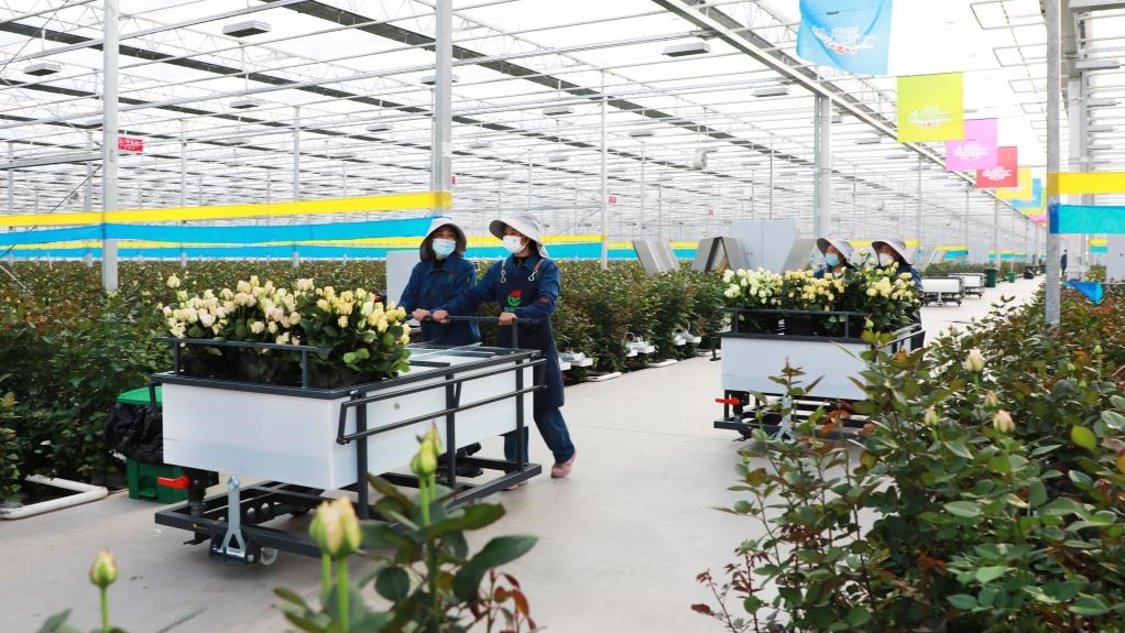 在位于甘肅省臨夏市的百益億農(nóng)國際鮮花港,工人們正在搬運剛剛采摘的玫瑰。(受訪單位供圖)