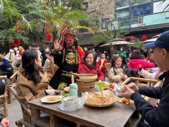 春節(jié)期間,重慶市渝中區(qū)山城巷中,“山城壩壩”茶館的院壩內(nèi)坐滿了客人。人們一邊圍爐煮茶,一邊欣賞臺(tái)上的傳統(tǒng)藝術(shù)表演,川劇變臉演員剎那間切換臉譜,贏得滿堂喝彩。老板舒蓉?zé)崆檎泻糁腿耍瑢⒉杷?、點(diǎn)心端到桌上,忙得不亦樂乎。“今年春節(jié)的客流量遠(yuǎn)超預(yù)期,營(yíng)業(yè)額是去年同期的七八倍?!?/p>
