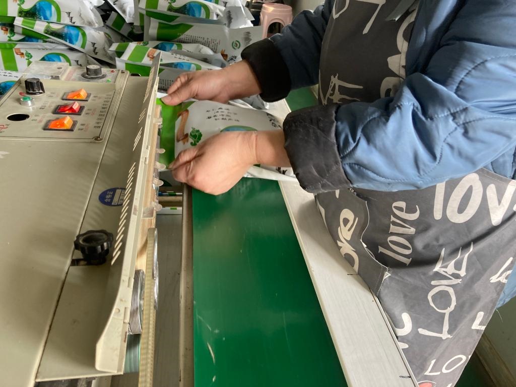 悅來(lái)頤和食用菌種植專業(yè)合作社社員在進(jìn)行猴頭菇產(chǎn)品包裝塑封。新華社記者 金地 攝