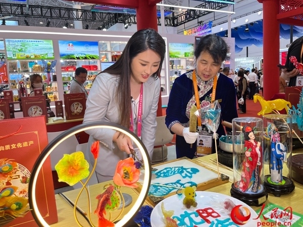 “我們的糖人制作技藝興于清朝道光年間,技法分為吹、塑、畫。結(jié)合消費(fèi)新需求,我們推出了一些新產(chǎn)品,很受年輕人喜歡。在消博會(huì)上,通過展示糖人技藝,讓更多的消費(fèi)者了解傳統(tǒng)文化,喜歡上我們的作品。”沈陽李氏糖人制作技藝第五代傳承人李鳳艷表示。