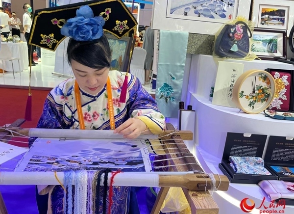 參展商現(xiàn)場(chǎng)制作國(guó)家級(jí)非物質(zhì)文化遺產(chǎn)渤海靺鞨繡。人民網(wǎng)記者 杜燕飛攝
