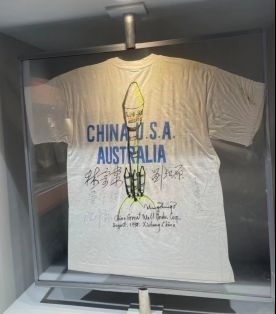 再給大家推薦一個(gè)不容錯(cuò)過的“打卡點(diǎn)”:澳星發(fā)射成功紀(jì)念T恤。這件T恤全部都是著名航天老專家們的“親簽”:林宗棠(時(shí)任航空航天部部長)、劉紀(jì)原(時(shí)任航空航天部副部長)、沈辛蓀(時(shí)任中國運(yùn)載火箭研究院院長)、王德臣(時(shí)任長二E火箭總設(shè)計(jì)師)、屠守鍔(時(shí)任長二E火箭技術(shù)總顧問)等。在紀(jì)念T恤的C位,還有劉竹生院士親筆畫的長征二號E運(yùn)載火箭(即“長二捆”火箭)的漫畫圖。可謂眾“星”云集,珍貴程度可想而知。