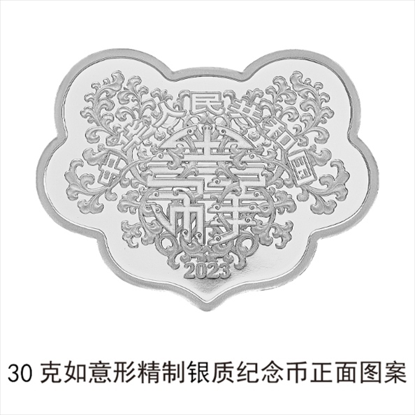 30克如意形銀質(zhì)紀念幣為精制幣,含純銀30克,外接矩形36毫米×47毫米,面額10元,成色99.9%,最大發(fā)行量20000枚。