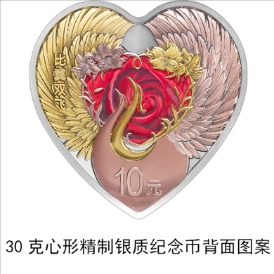 30克心形銀質(zhì)紀念幣為精制幣,含純銀30克,外接正方形邊長40毫米,面額10元,成色99.9%,最大發(fā)行量50000枚。