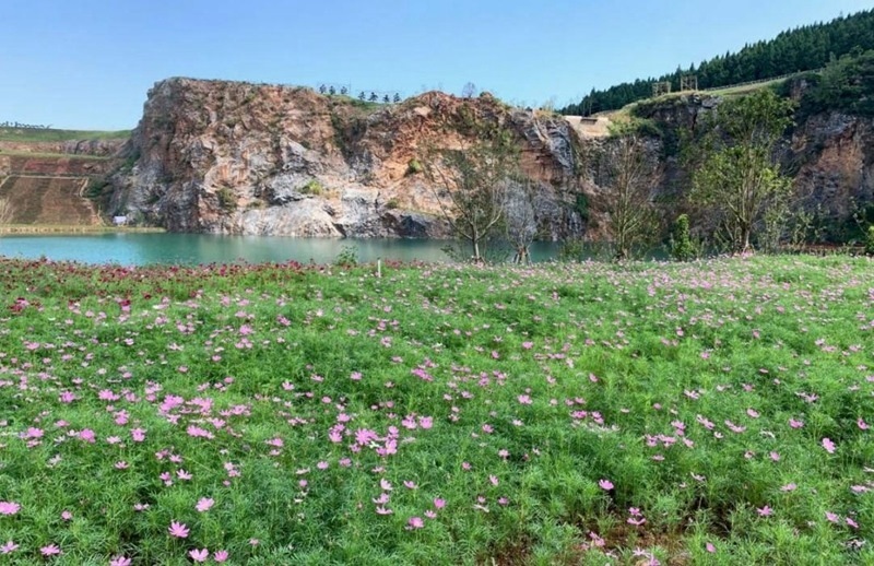 靈山生態(tài)文化旅游區(qū)已打造出繽紛的山林景觀。景區(qū)內(nèi),金色梯田美不勝收,拾階而上,高山草甸順著山勢起伏;一棵“孤獨(dú)的樹”矗立山巔,俯瞰遠(yuǎn)處的油菜花海、采礦舊址;穿越千株櫻園、桃林蜿蜒直達(dá)谷底,“礦坑花園”已成為絕佳的拍照打卡地。