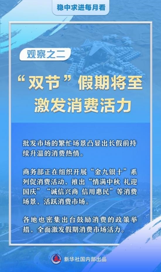 商務(wù)部新聞發(fā)言人何亞東介紹,商務(wù)部正在組織開展“金九銀十”系列促消費活動,推出“情滿中秋 禮迎國慶”“誠信興商 信用惠民”等消費場景,活躍消費市場。