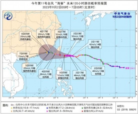 9月2日08時至3日08時,受“蘇拉”影響,南海西北部、北部灣東部、瓊州海峽及廣東沿海、廣西南部沿海、珠江口以及香港和澳門等地將有7-9級、陣風(fēng)10-11級的大風(fēng),“蘇拉”中心經(jīng)過的附近海面或地區(qū)風(fēng)力有12-13級、陣風(fēng)14-15級;受“??庇绊?,臺灣海峽、浙江南部沿海、福建沿海、廣東東部沿海、臺灣島沿海將有6-7級,陣風(fēng)8級大風(fēng),臺灣以東洋面部分海域風(fēng)力可達(dá)8-10級,陣風(fēng)11-12級,“??敝行慕?jīng)過的附近海面風(fēng)力可達(dá)12-13級,陣風(fēng)14級。