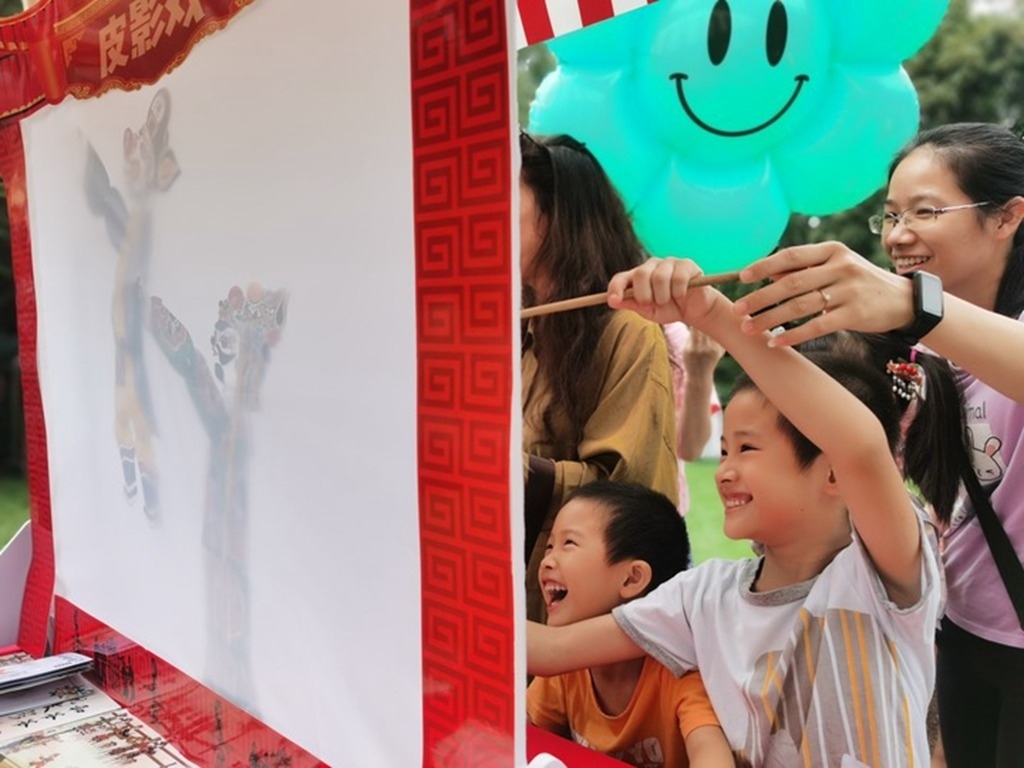 在上海桂林公園舉辦的“唐韻中秋”活動(dòng)上,孩童體驗(yàn)皮影戲。 新華社記者 陳愛平 攝