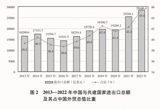 貿(mào)易投資規(guī)模穩(wěn)步擴(kuò)大。2013-2022年,中國與共建國家進(jìn)出口總額累計(jì)19.1萬億美元,年均增長6.4%;與共建國家雙向投資累計(jì)超過3800億美元,其中中國對(duì)外直接投資超過2400億美元;中國在共建國家承包工程新簽合同額、完成營業(yè)額累計(jì)分別達(dá)到2萬億美元、1.3萬億美元。2022年,中國與共建國家進(jìn)出口總額近2.9萬億美元,占同期中國外貿(mào)總值的45.4%,較2013年提高了6.2個(gè)百分點(diǎn);中國民營企業(yè)對(duì)共建國家進(jìn)出口總額超過1.5萬億美元,占同期中國與共建國家進(jìn)出口總額的53.7%。