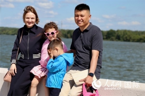 邢亮與妻子娜斯佳還有孩子們在湖邊散步。人民網記者 朱虹攝