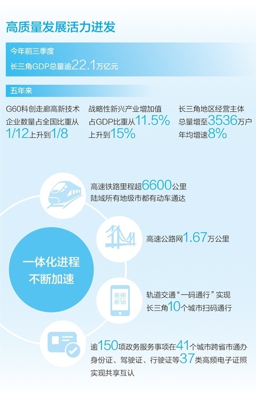 今年前三季度,長三角GDP總量逾22.1萬億元,占全國GDP總量比重較2022年同期有所提升,三省一市經(jīng)濟(jì)增速均超過了全國平均水平;作為長三角一體化發(fā)展國家戰(zhàn)略的先手棋和突破口,長三角生態(tài)綠色一體化發(fā)展示范區(qū)掛牌以來,共形成136項務(wù)實有效的制度創(chuàng)新成果,其中38項已面向全國復(fù)制推廣;已有逾150項政務(wù)服務(wù)事項可在長三角41個城市跨省市通辦,實現(xiàn)身份證、駕駛證、行駛證等37類高頻電子證照的共享互認(rèn)……