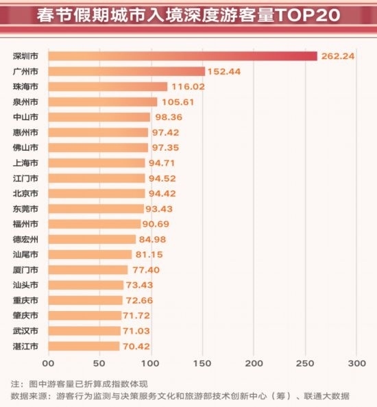 珠三角城市接待入境游客量高。春節(jié)假期,入境游客大數(shù)據(jù)樣本顯示,入境深度游客量前3的城市均為珠三角城市,珠三角9個城市均位列入境游深度游客量前20,珠三角城市入境深度游客量達到抽樣總體樣本的三分之一以上。