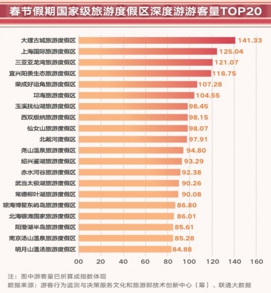 春節(jié)假期,全國63家國家級旅游度假區(qū)共接待深度游客(在度假區(qū)停留2小時以上的游客人數(shù),本部分以下簡稱“深度游”)793.4萬人,按可比口徑較2023年增長了42.3%,增長顯著。其中深度游前20的度假區(qū)共接待478.5萬人。