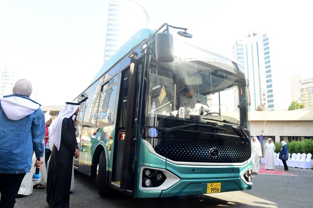 這是2022年12月21日在科威特首都科威特城拍攝的科威特首輛電動客車運(yùn)營儀式上的電動金龍客車。新華社記者 尹炣 攝