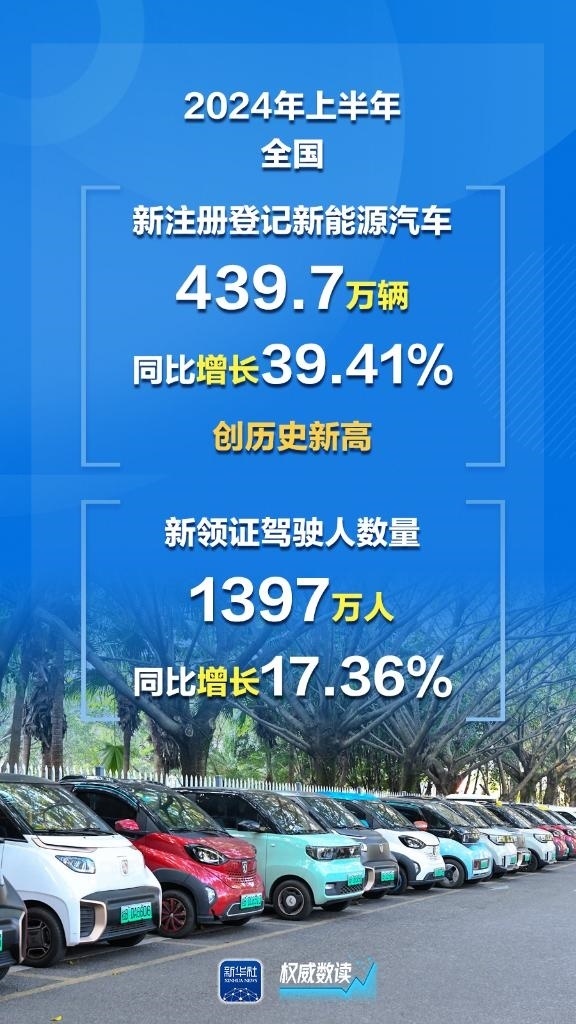 公安部7月8日發(fā)布最新統(tǒng)計數(shù)據(jù),截至2024年6月底,全國機動車保有量達4.4億輛,機動車駕駛人5.32億人;上半年新注冊登記新能源汽車439.7萬輛,同比增長39.41%,創(chuàng)歷史新高;上半年全國新領證駕駛人數(shù)量1397萬人。