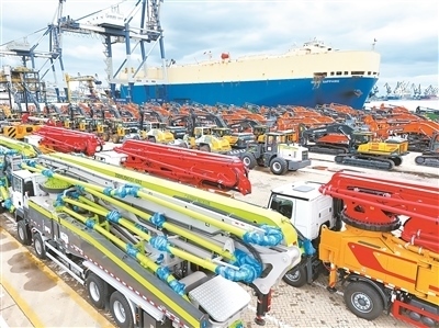 10月14日,國產工程機械在山東港口煙臺港集結等待裝船出口。唐 克攝(人民視覺)