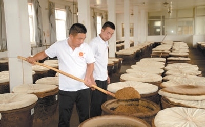 一旁,28歲的學徒李君正把缸里的醋醅翻到另一個醋缸之中。這是為了降溫而進行的“打平翻缸”操作,要持續(xù)15天時間?!八螏煾嫡f,發(fā)酵環(huán)節(jié)最難掌握的就是溫度的控制和時機。”以前種地為生的李君,已經(jīng)跟著宋俊鵬學了5年釀醋,一個月有將近4000元的收入,“學會獨門技藝,咱也是手藝人了!”