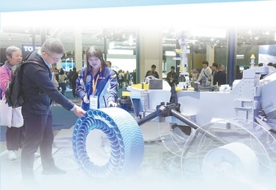 第七屆中國(guó)國(guó)際進(jìn)口博覽會(huì)上,觀眾正在了解米其林月球探測(cè)車輪胎。