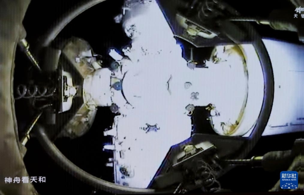 4月24日在北京航天飛行控制中心拍攝的神舟二十號(hào)載人飛船成功對(duì)接空間站天和核心艙畫(huà)面。新華社記者 金立旺 攝