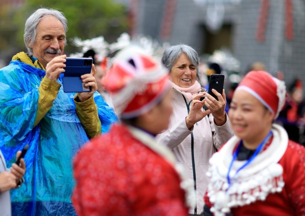 4月12日,外國游客在貴州省黔東南苗族侗族自治州臺江縣舉行的“苗族姊妹節(jié)”慶?;顒由吓臄z。新華社記者劉續(xù) 攝