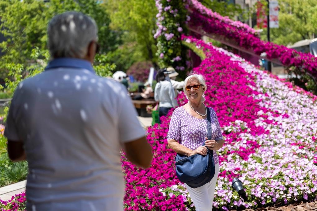 4月18日,外國游客在上海國際花展黃浦新天地主會場留影。新華社記者王翔 攝