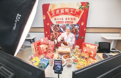 在浙江省嘉興市南湖區(qū)湘家蕩農(nóng)業(yè)加工園,老字號(hào)企業(yè)嘉興文虎醬鴨股份有限公司的直播間內(nèi),工作人員在直播銷(xiāo)售醬鴨。