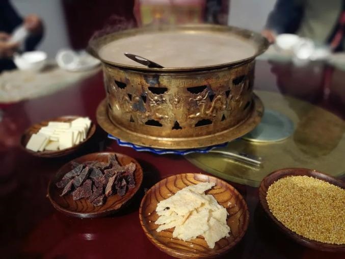 傳統(tǒng)鍋茶的制作方法是先用銅鍋將奶茶熬好,之后加入風干肉、奶酪、奶皮子等,在鍋中邊煮邊吃。吃的時候將奶茶盛在碗中,加上奶豆腐和炒米,再和黃油混在一起。越往后,炒米和奶豆腐泡得越軟,味道口感越好。鍋茶咸咸的口味中含有濃濃的奶香,讓人回味無窮。