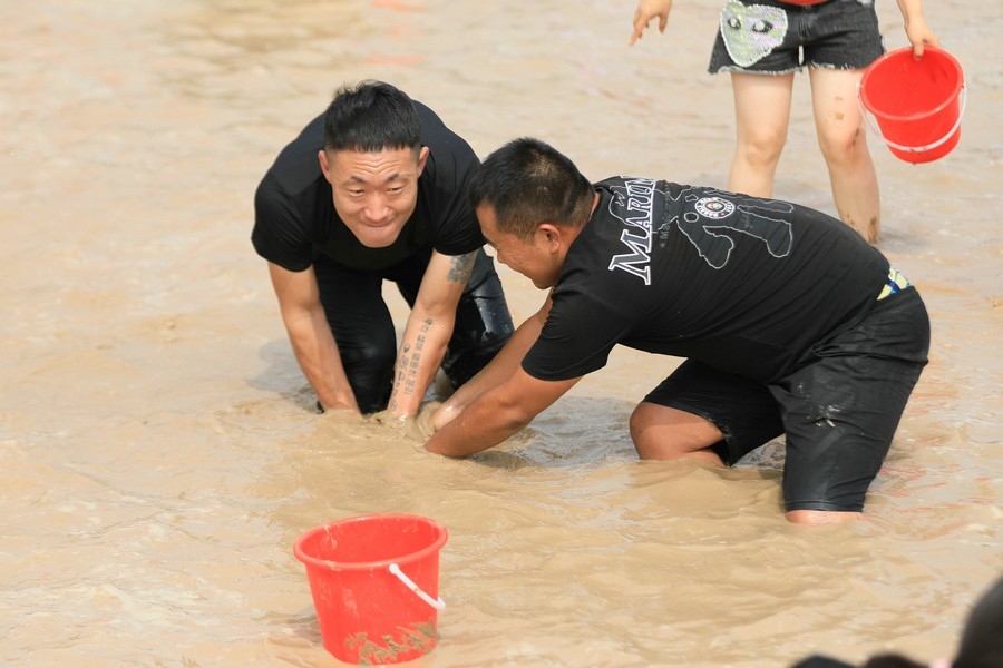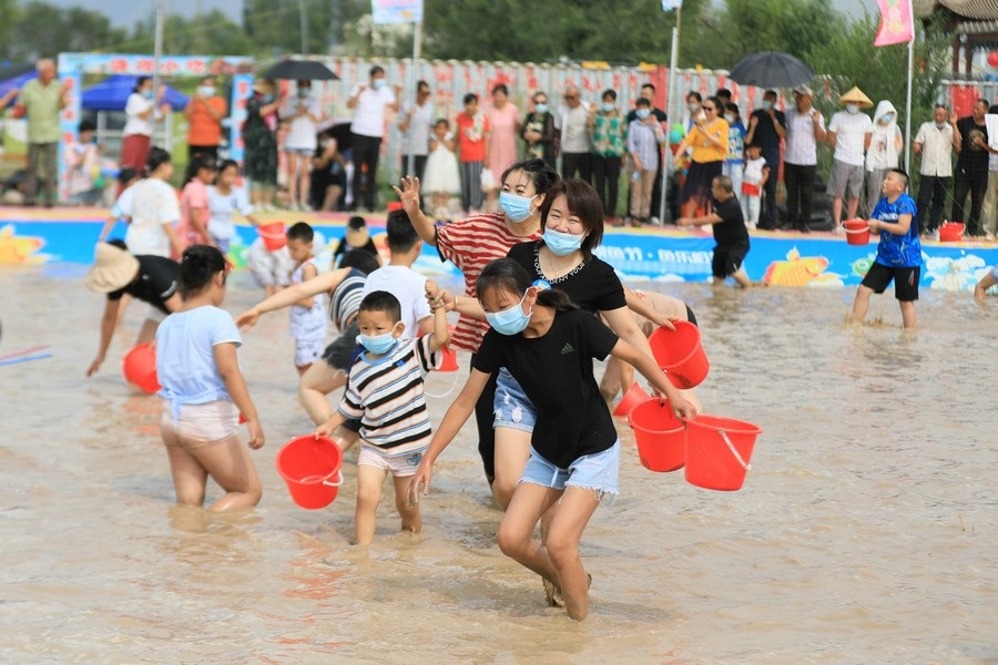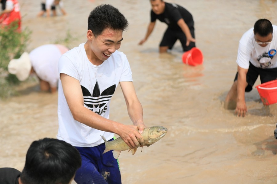 隨著主持人的一聲號令,來自呼和浩特市區(qū)和土默特左旗的眾多參與者,挽起褲管,光著腳丫,沖進池塘,展開了一場摸魚大比拼。