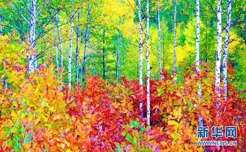 一陣秋風(fēng)吹過,松樹、白樺、柞樹齊抖葉片,一叢深、一叢淺,綠葉點(diǎn)點(diǎn)映著黃葉,層林盡染,似一幅幅鋪天蓋地潑彩的油畫。(9月28日攝)新華網(wǎng)發(fā)(欒維敬 攝)