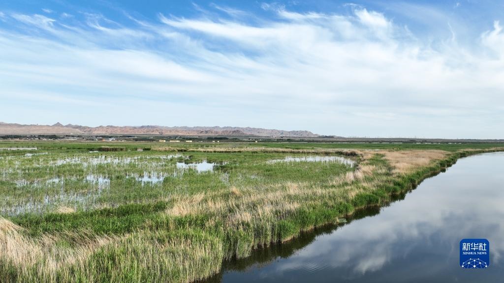 這是6月4日拍攝的位于內(nèi)蒙古巴彥淖爾市烏拉特前旗的烏梁素海(無人機全景照片)。