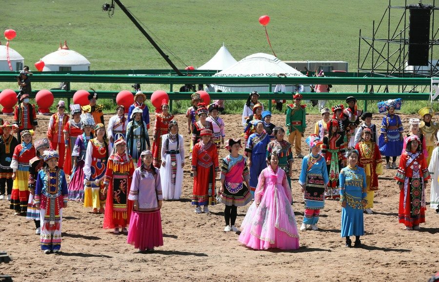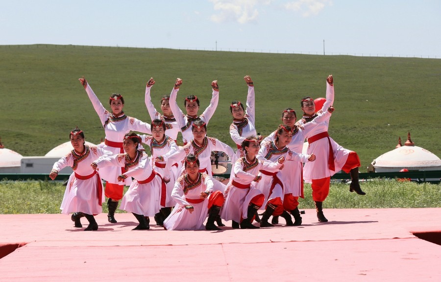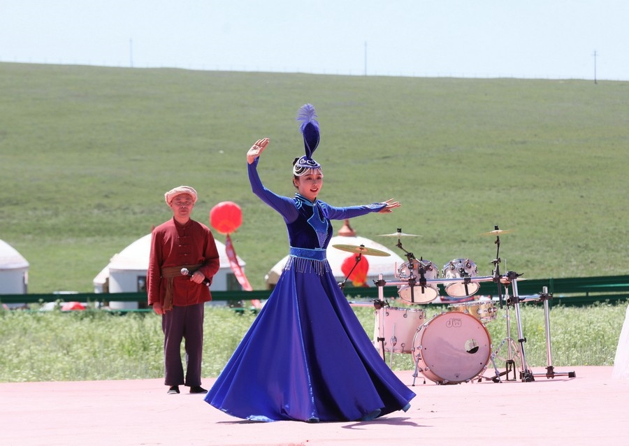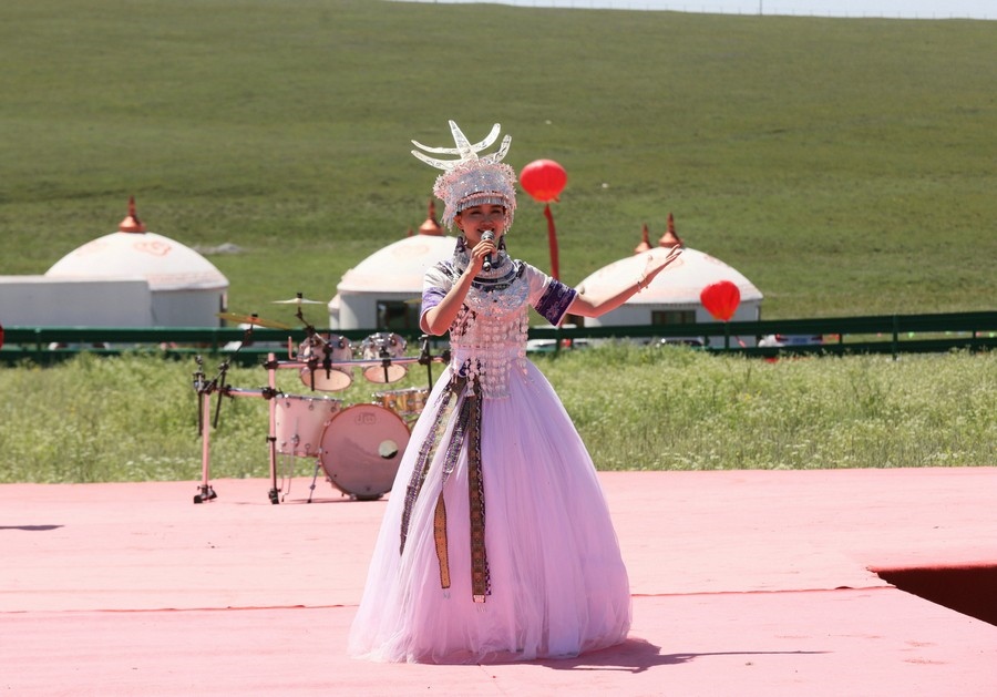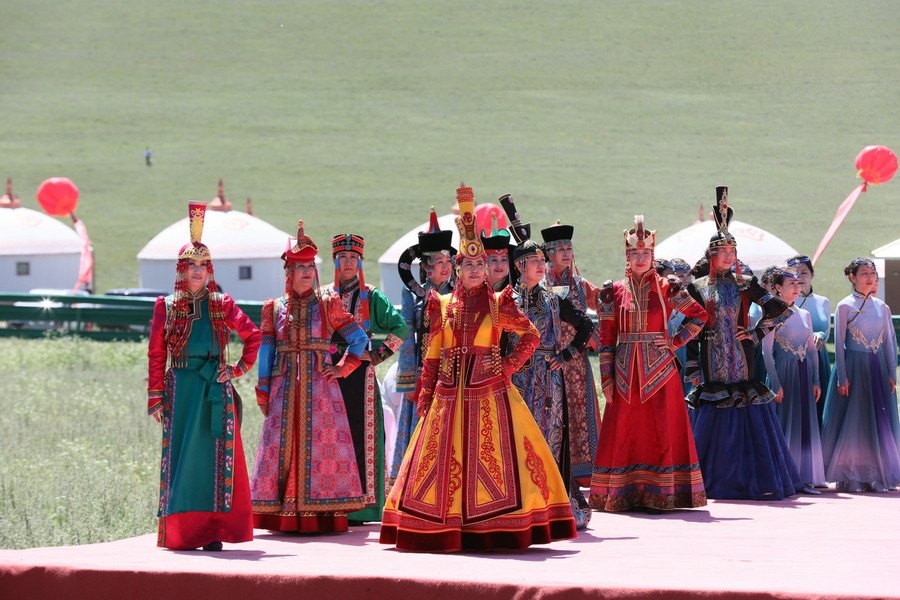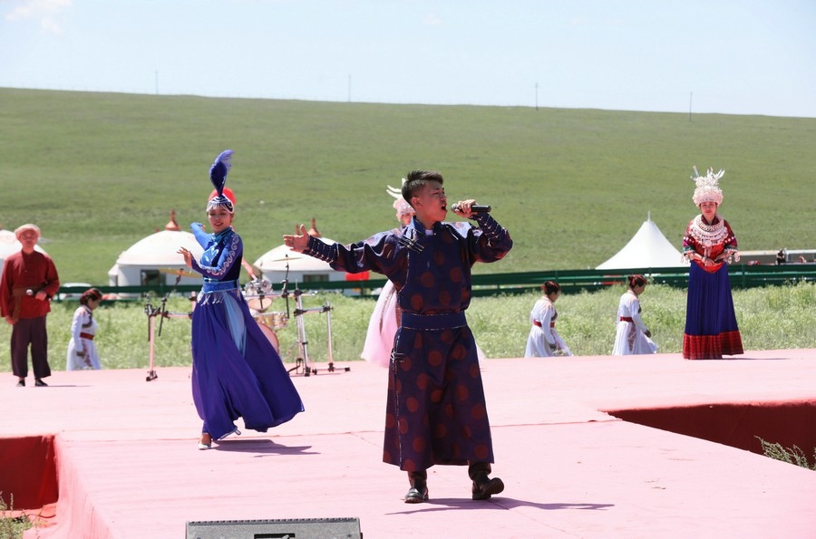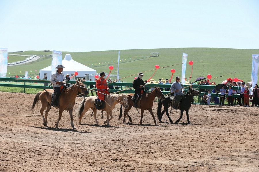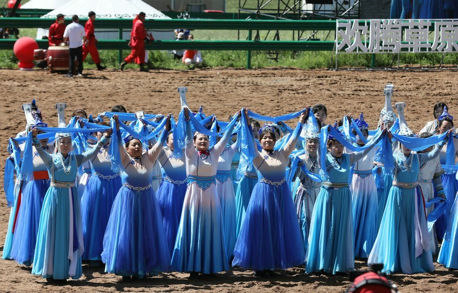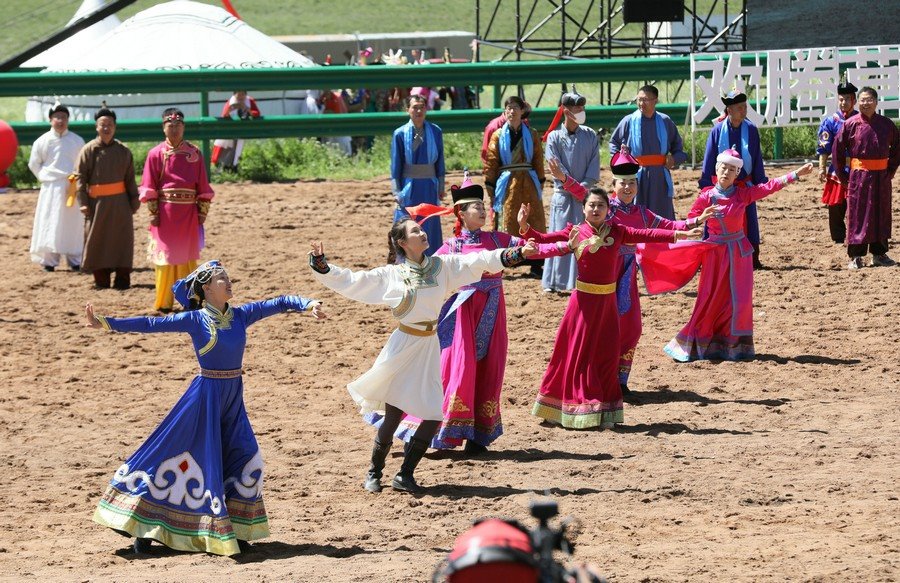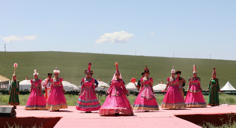 伴著悠揚的歌聲,踏著激昂的步伐,在旗幟方隊的引領下,哈達方隊、民族方隊、烏蘭牧騎方隊、牧馬人方隊、裁判員及運動員方隊依次走進會場。隨著彩煙燃放,氣球升空,那達慕在梅林組合的歌曲《歡騰那達慕》中拉開帷幕。隨后,歌伴舞《石榴花開》等節(jié)目輪番登場,現(xiàn)場觀眾掌聲雷動,讓來自全國各地的游客在紅石崖高山牧場領略了草原的柔情。