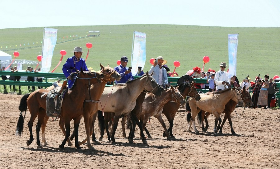 文藝演出結束后,進行了傳統(tǒng)的那達慕賽事項目。賽馬場上群馬奔騰、塵土飛揚,場面蔚為壯觀,騎手們揚鞭策馬,展現(xiàn)出精湛的騎術,贏得觀眾陣陣歡呼。摔跤場上,搏克手你來我往互不相讓,斗智斗勇……