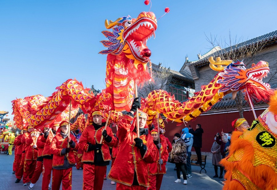 2024年2月15日,民間藝人在呼和浩特新春文化廟會(huì)現(xiàn)場(chǎng)進(jìn)行舞龍表演。丁根厚 攝
