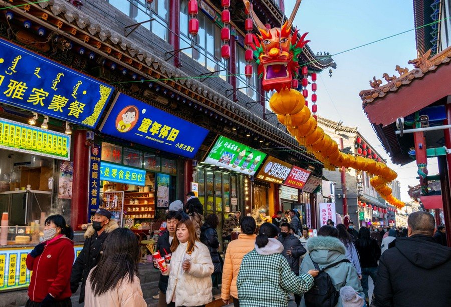 2024年2月15日,人們?cè)诤艉秃铺厥杏袢獏^(qū)塞上老街旅游休閑街區(qū)游玩。丁根厚 攝