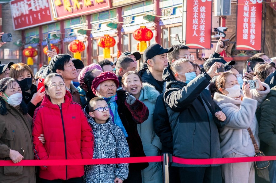 2024年2月15日,人們?cè)诤艉秃铺厥杏袢獏^(qū)塞上老街旅游休閑街區(qū)觀看社火表演。丁根厚 攝