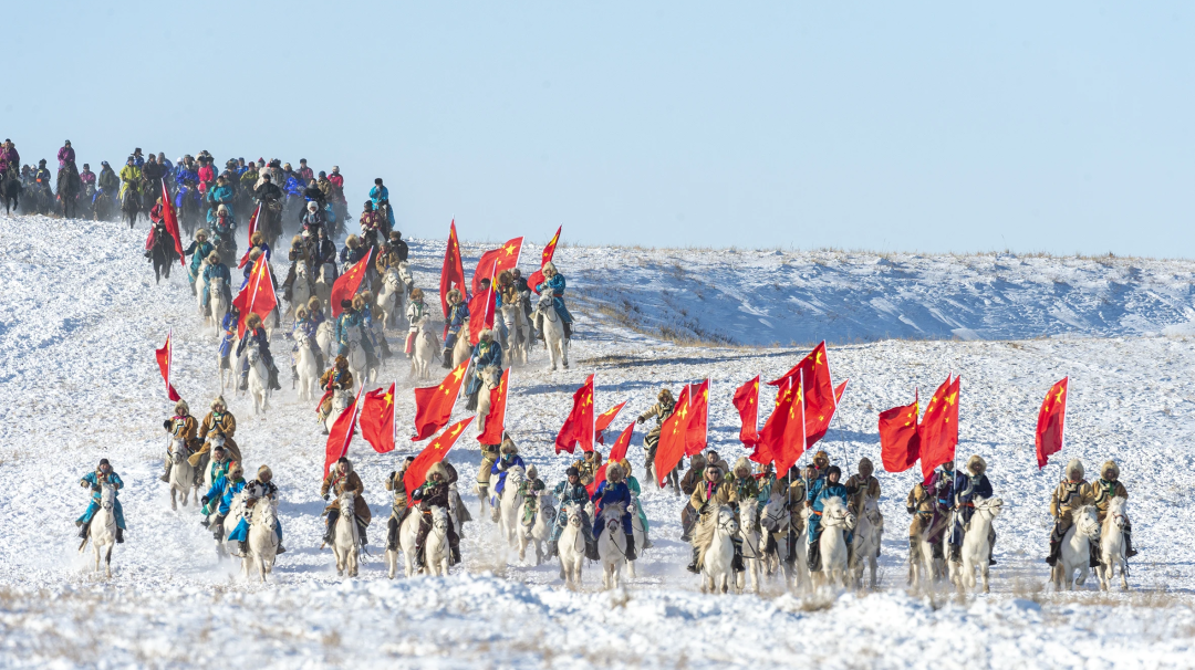 9時50分,在護旗方陣的護衛(wèi)下,鮮艷的五星紅旗冉冉升起,《義勇軍進行曲》響徹云霄,萬人肅立齊唱。方陣入場式上,200名農(nóng)牧民手持火紅的辣椒、金黃的向日葵和飽滿的西瓜,用豐收的喜悅“描繪”鄉(xiāng)村振興畫卷;400名“民族大家庭”方陣成員身著五彩盛裝,恰似民族團結(jié)的斑斕錦緞;企業(yè)代表、干部職工代表、裁判、射箭手、搏克手等方陣依次入場,大家精神抖擻,昂首闊步,展現(xiàn)出全旗各族人民團結(jié)奮進的精神面貌;最令人心潮澎湃的當(dāng)數(shù)蒙古馬方陣——百匹駿馬踏著《黑駿馬》的悠揚琴聲奔騰而來,馬蹄卷起草浪,鬃毛飛揚如旗,將北疆兒女的豪邁氣概演繹得淋漓盡致。