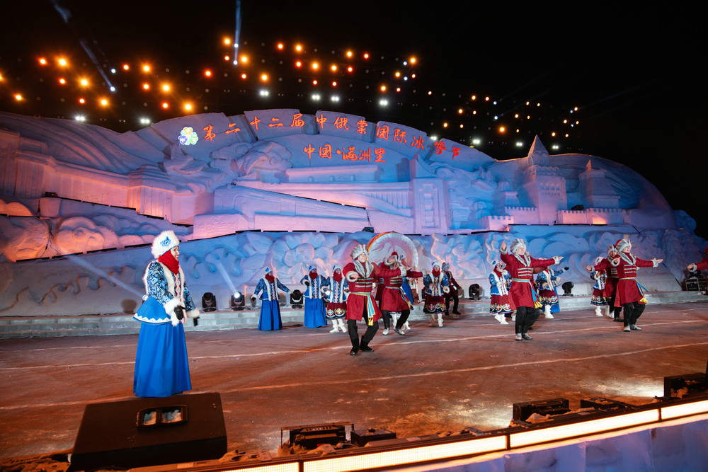 作為當(dāng)日重頭戲,冰雪節(jié)開幕式暨《冰雪芳華》主題樂園開園儀式于晚間精彩上演。中俄蒙三國表演團(tuán)隊輪番登臺,用悠揚(yáng)的歌聲、靈動的舞姿傳遞三國友誼,為現(xiàn)場觀眾獻(xiàn)上一場兼具民族風(fēng)情與國際視野的文化盛宴。