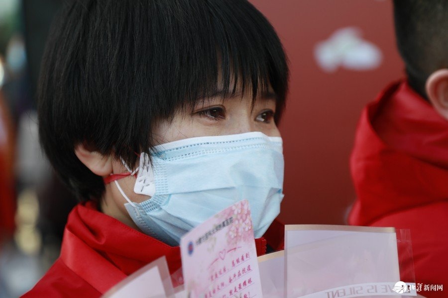 醫(yī)療隊隊長張卿代表發(fā)言,她難掩激動的心情,喜極而泣。她說,整個醫(yī)療隊用實際行動踐行了使命,沒有辜負所有人的期待,圓滿完成此次援鄂任務(wù)。她表達了對自治區(qū)衛(wèi)健委、學(xué)校及醫(yī)院后方關(guān)心與支持的感謝,表達了對所有附院大家庭和親人們的思念與感謝,“親人們,兄弟姐們們,我們平安回來了!你們的支持,是我們前行的最大動力!”