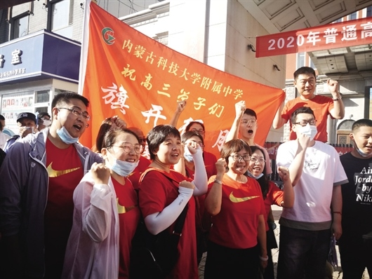 為學(xué)生送考是包四中的傳統(tǒng)。當(dāng)日7時許,身著“包四必勝”紅色T恤的高三年級組長楊文亮早早來到考場為學(xué)生送考。這名任教20年的教師已經(jīng)歷過6次高考,每一次他都要親自將學(xué)生送上考場。與他同來的十幾名包四中教師或與學(xué)生擊掌,或向他們打著必勝的手勢,激勵大家沉著應(yīng)考,考出水平。楊文亮說:“在每場考試結(jié)束前,老師們都會提前來到現(xiàn)場,等著同學(xué)們出來,給他們打氣,幫助他們調(diào)整情緒。有時學(xué)生會說考試題目比較難,這時老師們就會告訴學(xué)生不要過分焦慮,正常發(fā)揮出自己的實力就好,題難不是一人難,每名考生都會面對同樣的難題。通過這樣的交流為考生進行心理疏導(dǎo),消除考生緊張焦慮的情緒,繼續(xù)為接下來的考試做好準(zhǔn)備。”(策劃趙永峰 記者李碩 霍曉霞 萬菲 實習(xí)生許昕元 通訊員李瞳)