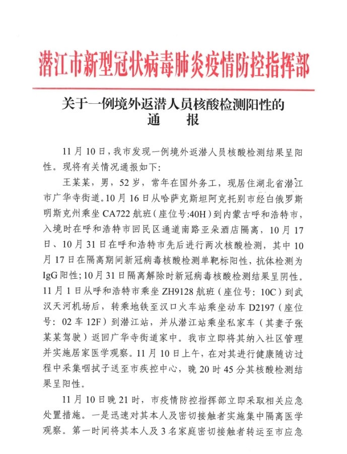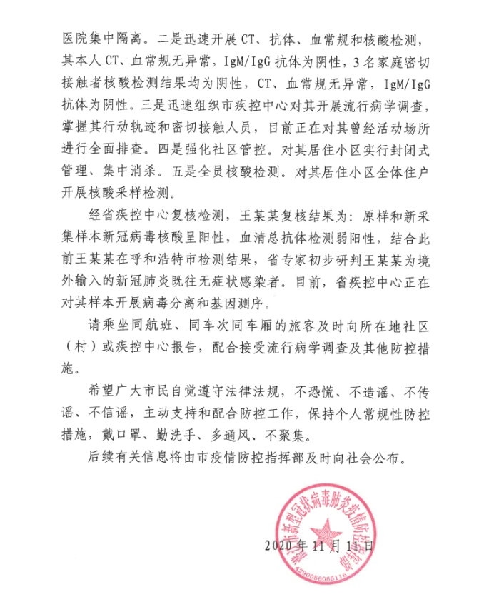 王某,男,于2020年10月17日從哈薩克斯坦阿克托別市經(jīng)白俄羅斯明斯克州乘坐CA722航班抵達(dá)呼和浩特市。10月17日至31日在呼和浩特市境外入呼人員集中隔離酒店單人單間集中隔離,10月17日經(jīng)呼和浩特海關(guān)核酸檢測(cè)(咽拭子)陰性,31日經(jīng)呼和浩特市疾控中心核酸檢測(cè)(咽鼻混合拭子)陰性。11月1日王某集中隔離期滿,乘坐專用大巴至白塔機(jī)場(chǎng),經(jīng)機(jī)場(chǎng)專用通道乘坐ZH9128航班抵達(dá)武漢天河機(jī)場(chǎng)后,乘地鐵、動(dòng)車、私家車返回潛江市家中。王某在呼集中隔離期間,嚴(yán)格按照《新型冠狀病毒肺炎防控方案(第七版)》及入境人員管理要求落實(shí)了管控措施。