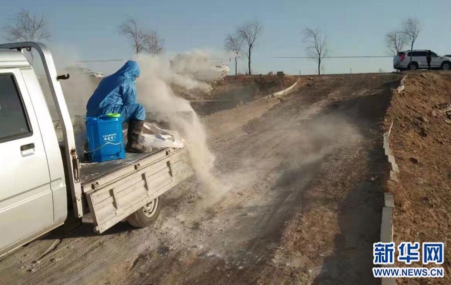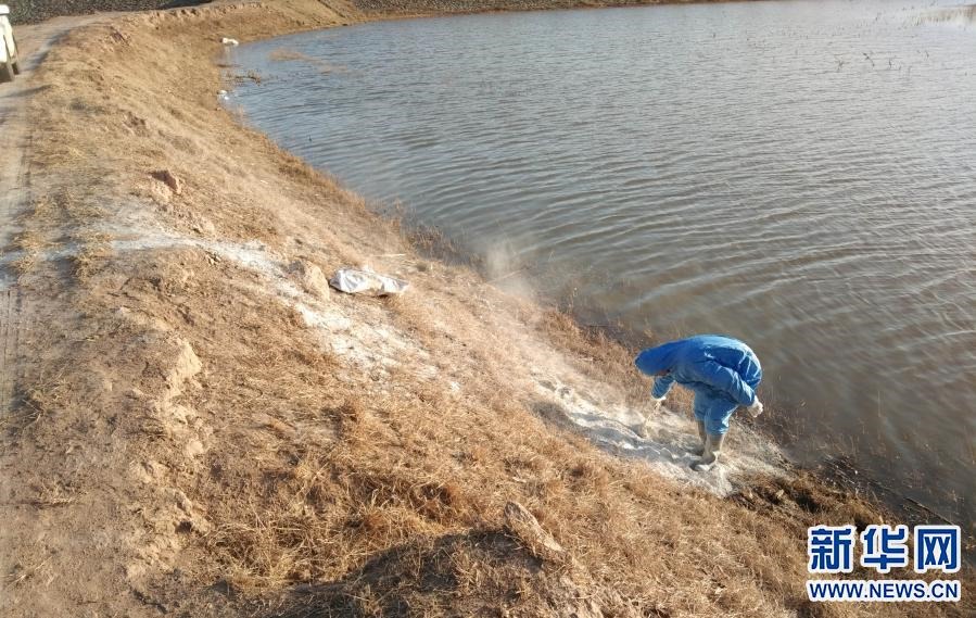 3月21日,達拉特旗疫控人員對黃河國堤內(nèi)死豬打撈地進行消毒。新華社發(fā)