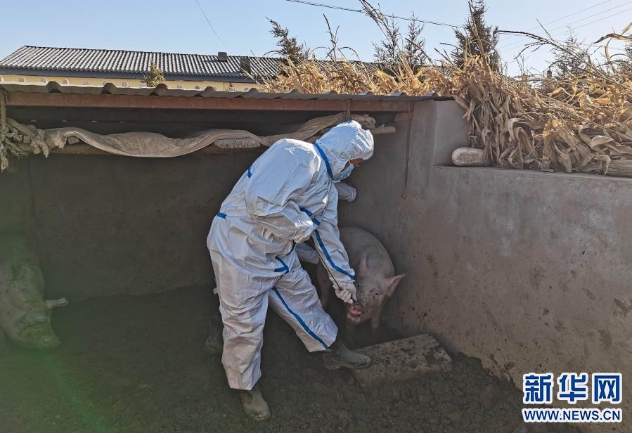 3月22日,達拉特旗疫控人員對農(nóng)戶養(yǎng)殖的生豬進行檢測采樣。新華社發(fā)