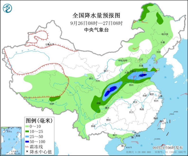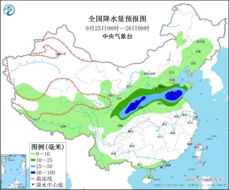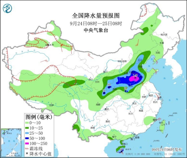 9月24日08時(shí)至25日08時(shí),西北地區(qū)東部、華北大部、黃淮中北部、海南島等地部分地區(qū)有中到大雨,其中,陜西中南部、華北南部、山東西部、河南北部、海南島東南部等地部分地區(qū)有暴雨或大暴雨(100~140毫米)。新疆南疆盆地等地部分地區(qū)有4~6級(jí)風(fēng),新疆東部部分地區(qū)有8~9級(jí)風(fēng)。