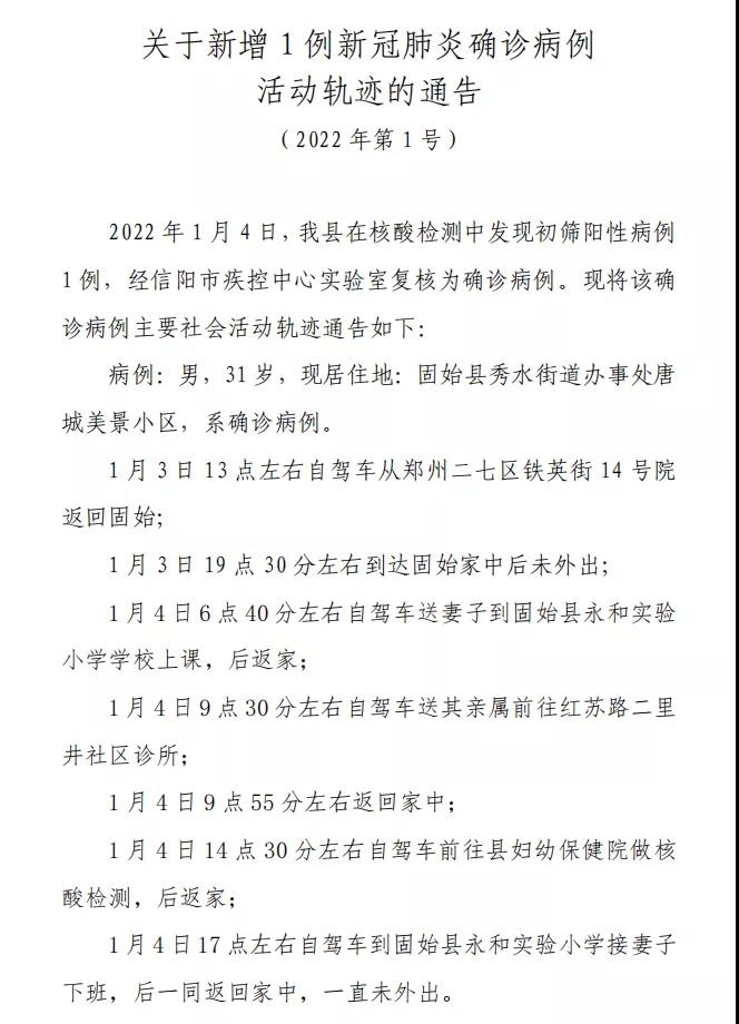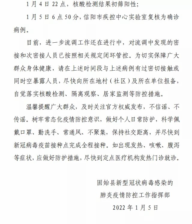 據(jù)固始縣委宣傳部微信公眾號(hào)消息,1月4日,河南固始縣在核酸檢測(cè)中發(fā)現(xiàn)初篩陽性病例1例,經(jīng)信陽市疾控中心實(shí)驗(yàn)室復(fù)核為確診病例。